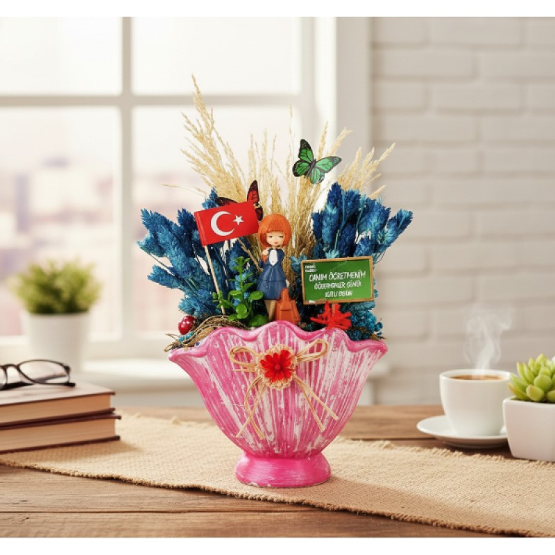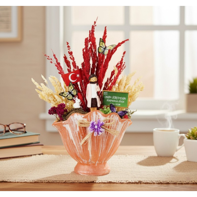 ChatGPT:VAZO MİDYE TERARYUM - ÖĞRETMENLER GÜNÜ HEDİYESİÜrün ÖzellikleriZarafet ve estetiği bir araya getiren Vazo Midye Teraryum, Öğretmenler Günü için anlamlı ve şık bir hediye alternatifi sunar. 10x19x32 cm ölçülerinde tasarlanan bu özel ürün, deniz kabuğunu andıran midye formlu vazo görünümüyle dikkat çeker. El işçiliğiyle hazırlanmış her bir teraryumda Türk bayrağı, kuru çiçekler, minyatür öğretmen figürleri, kelebek süslemeleri ve doğayı temsil eden renkli bitki detayları bir araya getirilmiştir.Bu göz alıcı aranjman, öğretmenlerinizin masasına ya da vitrinine zarif bir dokunuş katarken, “Canım Öğretmenim” yazılı minik panosuyla duygusal bir anlam taşır. Canlı renkleriyle bulunduğu ortama enerji katar, yıl boyunca solmadan öğretmenlerinize ilham verecek bir hatıra olur.Hediye kutusu ambalajıyla sunulan bu özel tasarım, doğrudan hediye edilmeye hazır şekilde gönderilir. Üretim el işçiliğiyle yapıldığından her biri özgün bir görünüme sahiptir. Model seçimi yapılamaz, görsellerdeki modellerden karışık olarak gönderim yapılır.Paket İçeriği1 adet Vazo Midye Teraryum - Öğretmenler Günü Hediyesi 1 adet Vazo Midye Teraryum