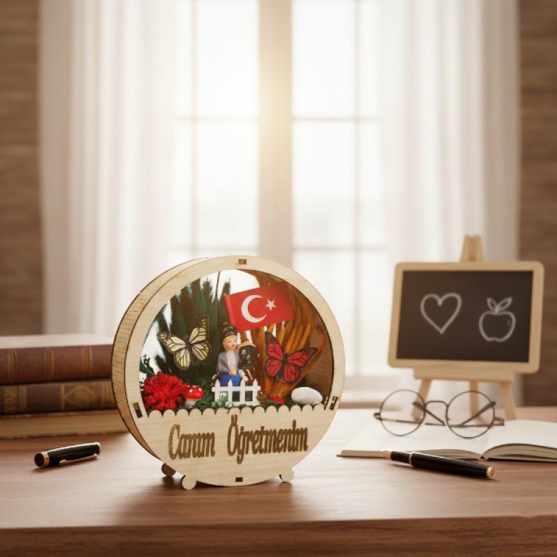 Zarif tasarımıyla dikkat çeken Yuvarlak Saksı Teraryum, öğretmenlere özel anlamlı ve estetik bir hediye alternatifidir. 7x17x17 cm ölçülerindeki bu ürün, kaliteli MDF malzemeden üretilmiştir. Yuvarlak formu ve “Canım Öğretmenim” yazılı detaylarıyla sevgi dolu bir görünüm sunar.Her bir modelin içinde Türk bayrağı, kuru çiçekler, kelebek süslemeler, mantar figürler ve öğretmen temalı minik objeler yer alır. Dekoratif masa üstü veya raf süsü olarak kullanılabilir. Renkli ve canlı görünümü sayesinde bulunduğu ortama neşe ve anlam katar.Ürün şeffaf hediye kutusuyla birlikte sunulmaktadır ve hediye etmeye hazır şekilde gelir. Model seçimi yapılamaz, görsellerde yer alan farklı tasarımlardan karışık olarak gönderim yapılır.